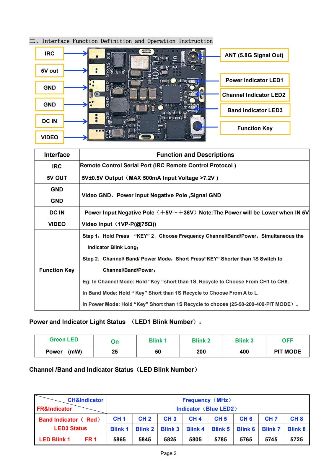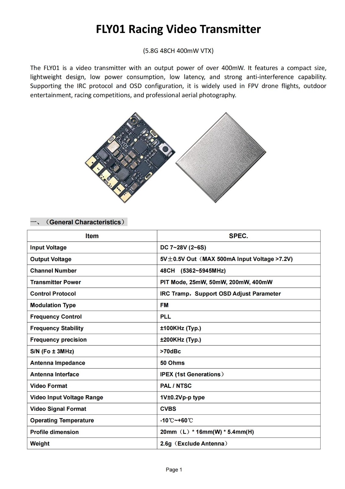5.8G 400mW 48CH VTX功率可调 竞技模拟图传,支持IRC协议,宽电源